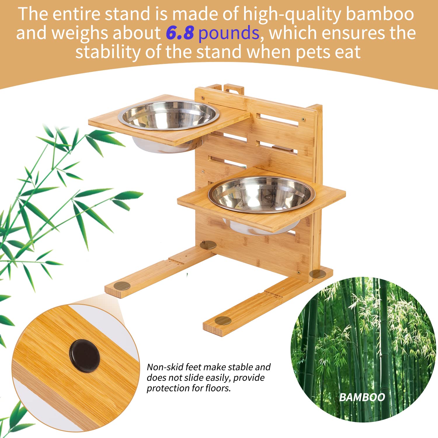 The special dual-tray structure allows two bowls to be installed on the same side or on opposite sides, making it convenient for feeding two dogs of different sizes at once. The base is reinforced with non-skid feet, preventing the stand from sliding or moving while pets eat. Weighing about 6.8 pounds, the bamboo body provides solid stability, ensuring that even larger dogs can eat comfortably without tipping or shaking the feeder.