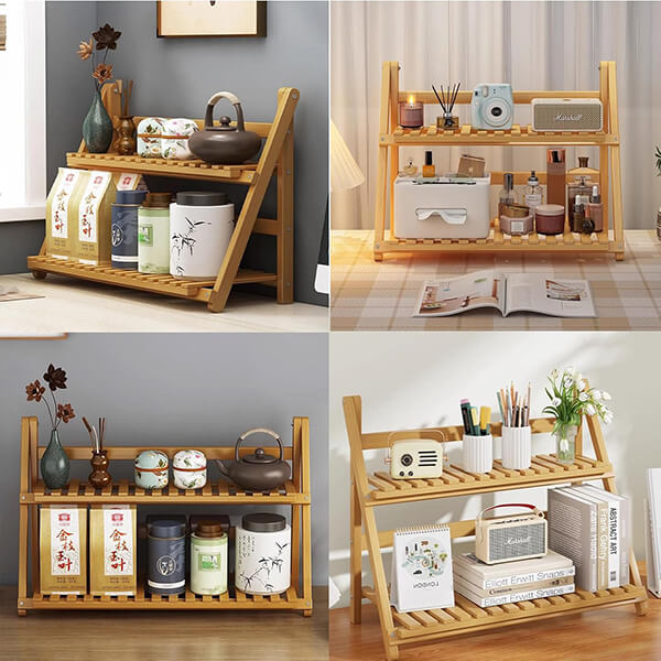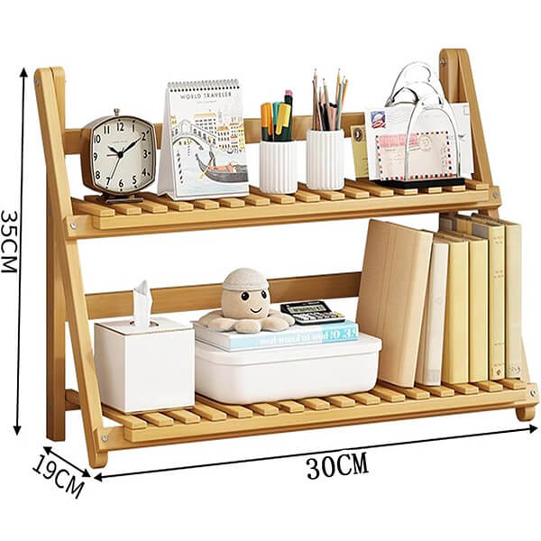 This wooden bookshelf features a foldable design, allowing it to collapse into a compact size for easy storage and transport. Perfect for desks, tables, or countertops, it optimizes space while keeping your area tidy