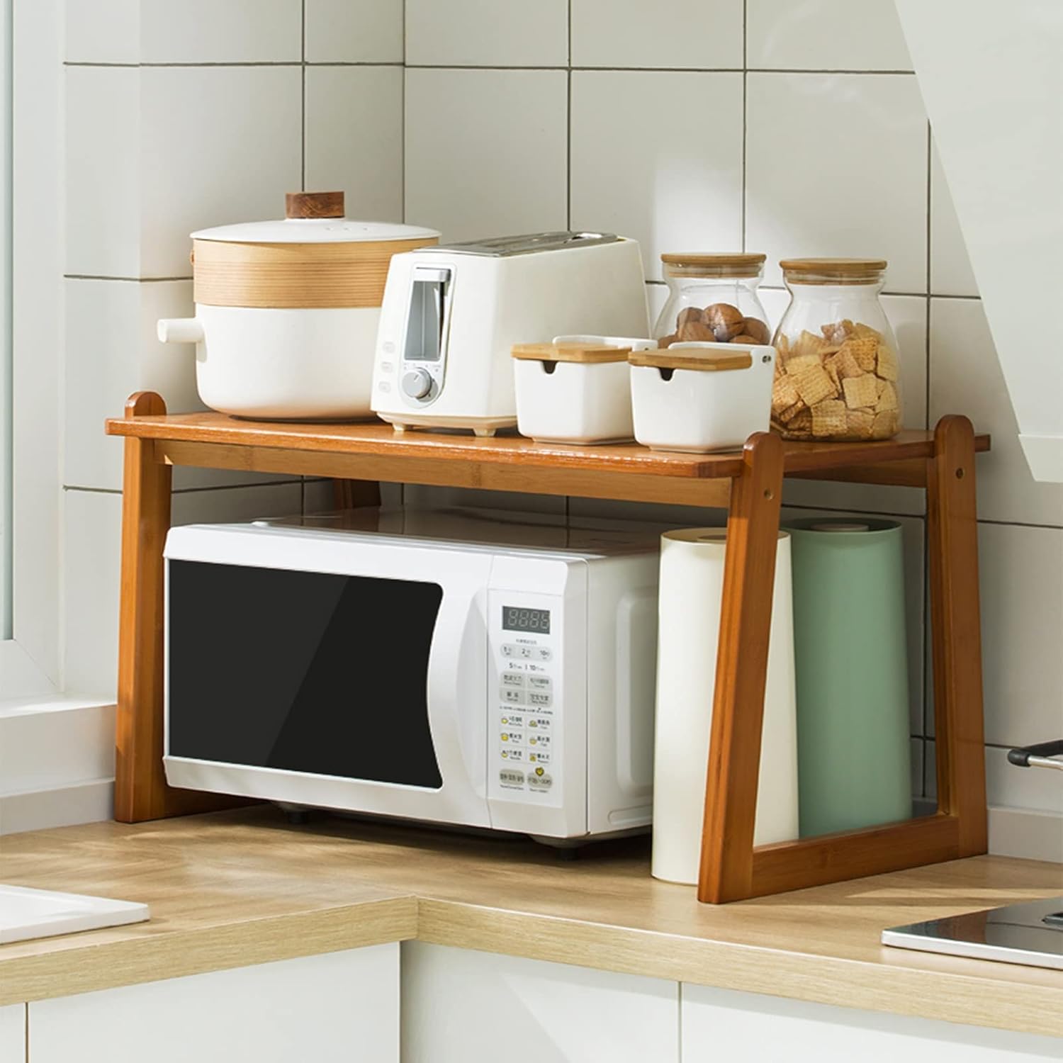 Upgrade your kitchen or professional food-service space with this two-tier natural bamboo microwave shelf organizer, thoughtfully designed to maximize countertop efficiency while maintaining a clean and modern aesthetic. Measuring 60 × 35 × 40 cm, this organizer provides generous storage capacity, making it an ideal solution for homes, restaurants, hotels, office pantries, and retail kitchenware collections.