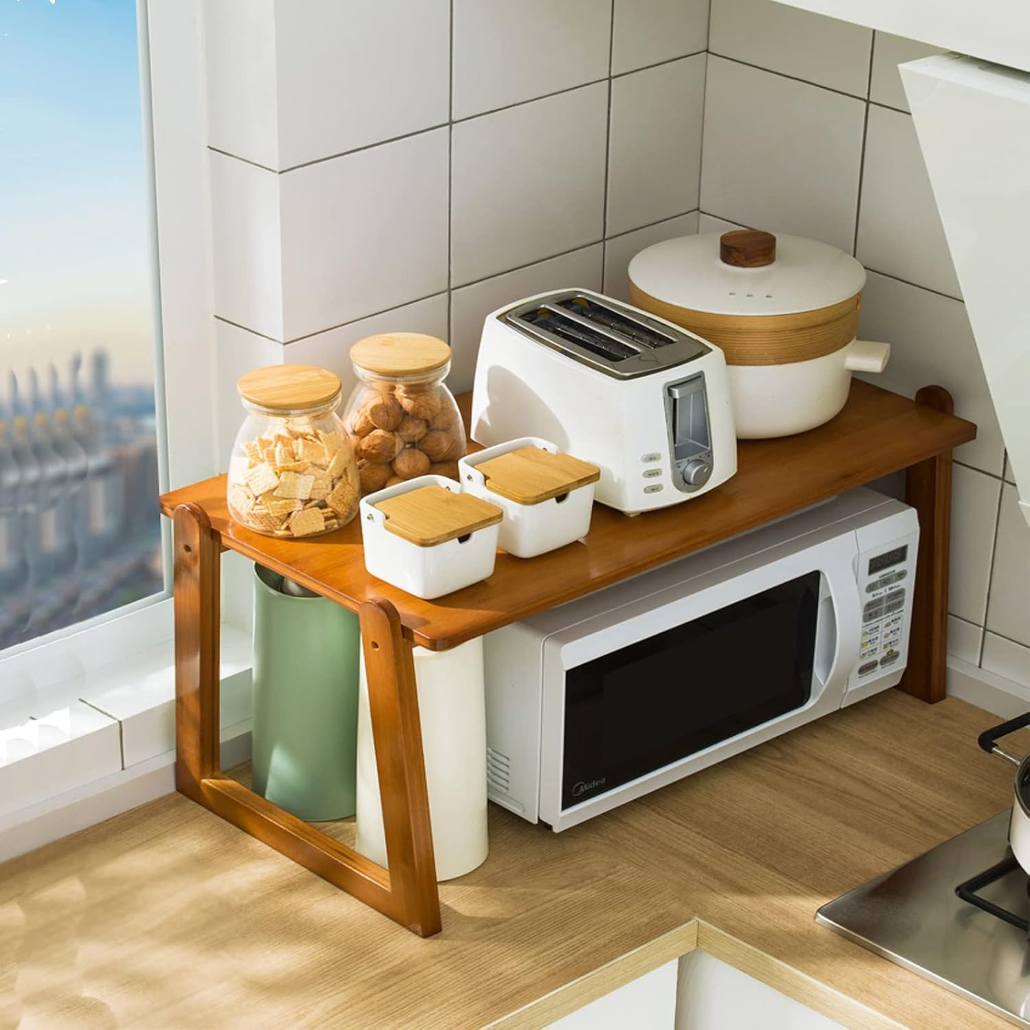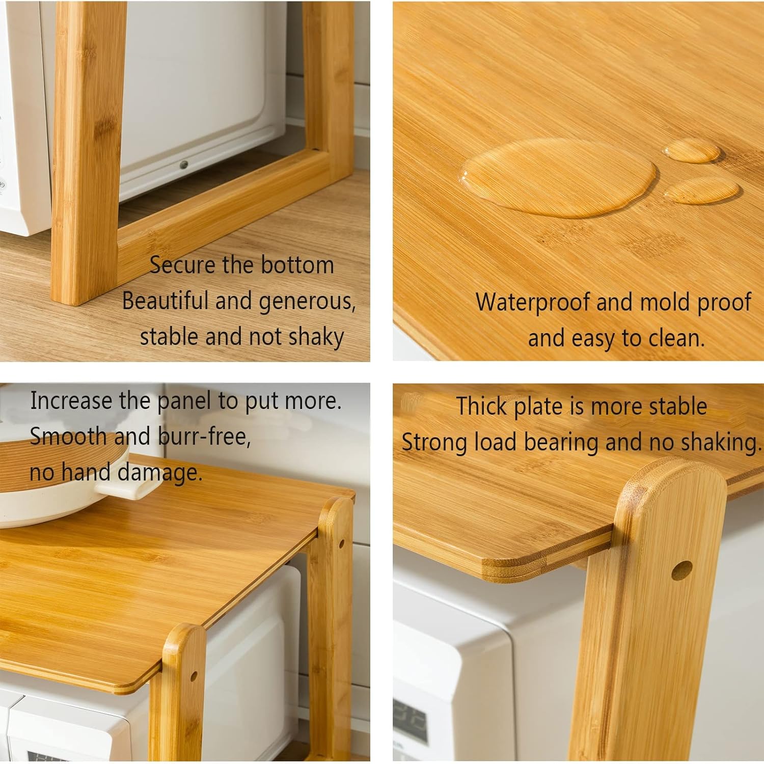 Crafted from premium natural bamboo, the rack features a strong, dense texture with excellent compressive strength. Its smooth finish brings a pleasant touch, while bamboo’s natural water resistance helps protect the structure from moisture and everyday wear. Built with a sturdy ladder-shaped support frame and a wide reinforced panel, the shelf remains stable even when holding heavier kitchen appliances. This construction significantly improves overall load-bearing performance, ensuring long-term reliability and safe daily operation.