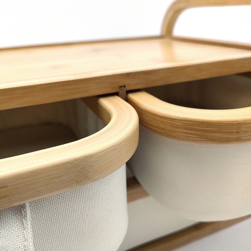 The organizer features two layers, including a smooth-sliding drawer and an open upper compartment for easy access to everyday items. A subtle fabric accent softens the look and adds warmth, blending seamlessly with the bamboo’s natural grain. Measuring 35 × 23 × 23 cm, it provides ample space without feeling bulky — ideal for storing cosmetics, stationery, jewelry, or daily essentials.