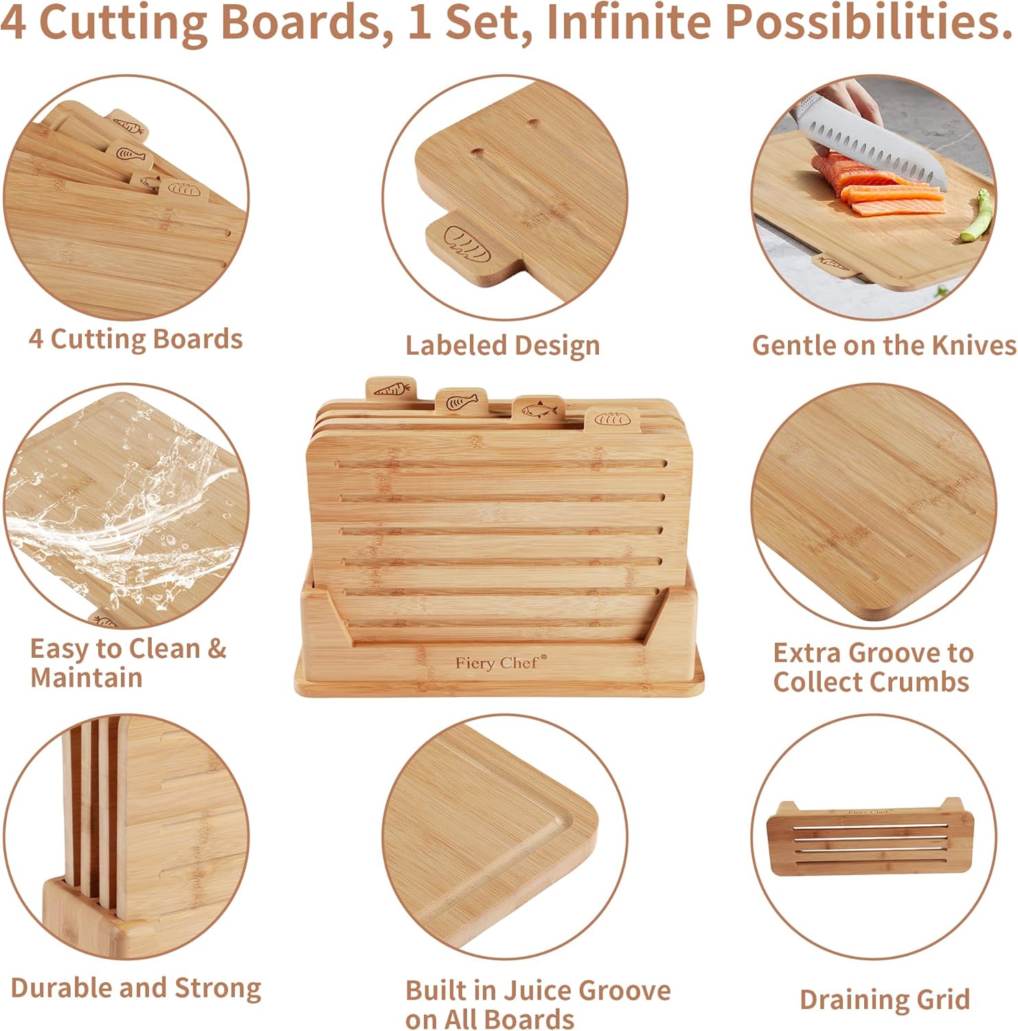 Made from 100% organic sustainable bamboo – sturdy, knife-friendly, double-sided, and naturally antibacterial. Each board features clear food icons (meat, fish, bread, vegetables/fruit) to prevent cross-contamination, deep juice grooves to contain liquids, and a compact upright holder for space-saving storage.
